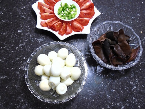 Bước 2: Trứng cút rửa sạch, bóc vỏ sau đó rửa lại lần nữa. Mộc nhĩ ngâm nở, cắt bỏ chân, rửa sạch thái khúc.